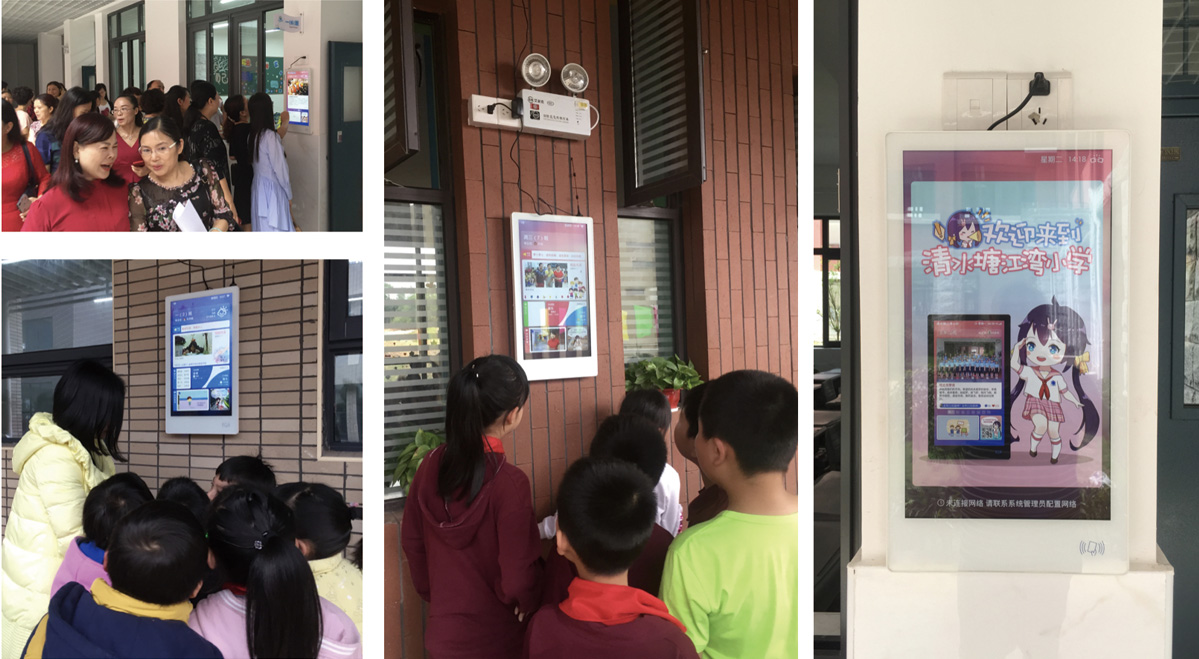 教室外墻空間有限,部分教室能安裝班牌的墻體非常狹窄。為了適應墻體寬度,部分學校無法采用大尺寸的橫屏方案,限制了班牌的展示效果?;勰苤腔郯嗯扑捎玫牧⑹秸故灸J胶芎玫慕鉀Q了窄墻體與大尺寸屏幕共存的問題,也杜絕了小尺寸屏幕產生的閱讀困難。